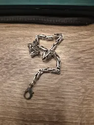 Een zilveren armband met schakels in een kettingpatroon. De armband heeft een haaksluiting.