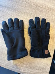 Set van zwarte handschoenen van verschillende materialen. De linkerhandschoen heeft een fleece-achtige structuur en de rechterhandschoen lijkt een dikkere stof met een elastische rand.
